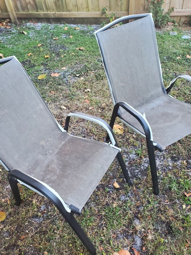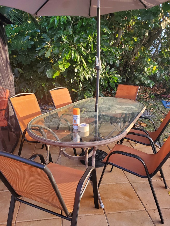 So I purchased 2 cans of the outdoor fabric paint and had the kids help me tape up the metal parts of the patio chairs and sit them in the grass. I had 6 chairs and one cushion to do. Y’all, 2 cans was NOT gon cut it so the people were right. I ended up purchasing 3 more cans and using about 1/4 of the fifth can to complete the job.