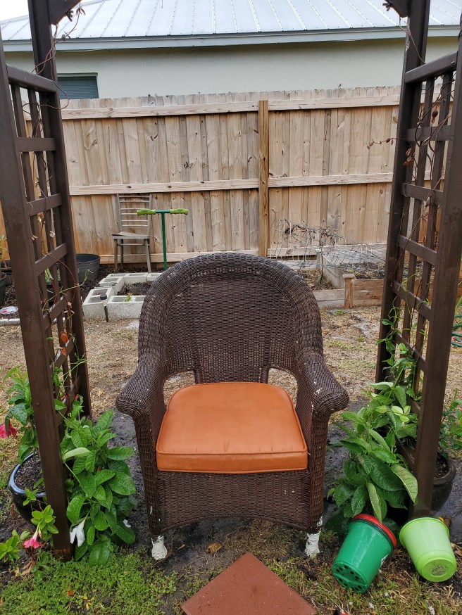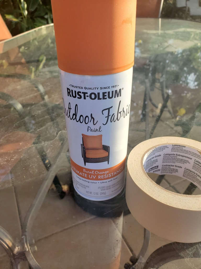 So I was in Home Depot minding my own business looking for dark brown spray paint for a grey side table in my gazebo. I promise I do nothing but rehab and paint things since coronavirus but that’s neither here nor there. Anyway, I always get Rust-Oleum because it always works for me. Well, I looked to my left and saw outdoor fabric paint. I have grey patio chairs that don’t fit the decor (and need a major power wash btw) but they were on sale at Aldi so I have them and a wicker chair I got while thrifting that has the ugliest cushion in it. Maybe this will work?